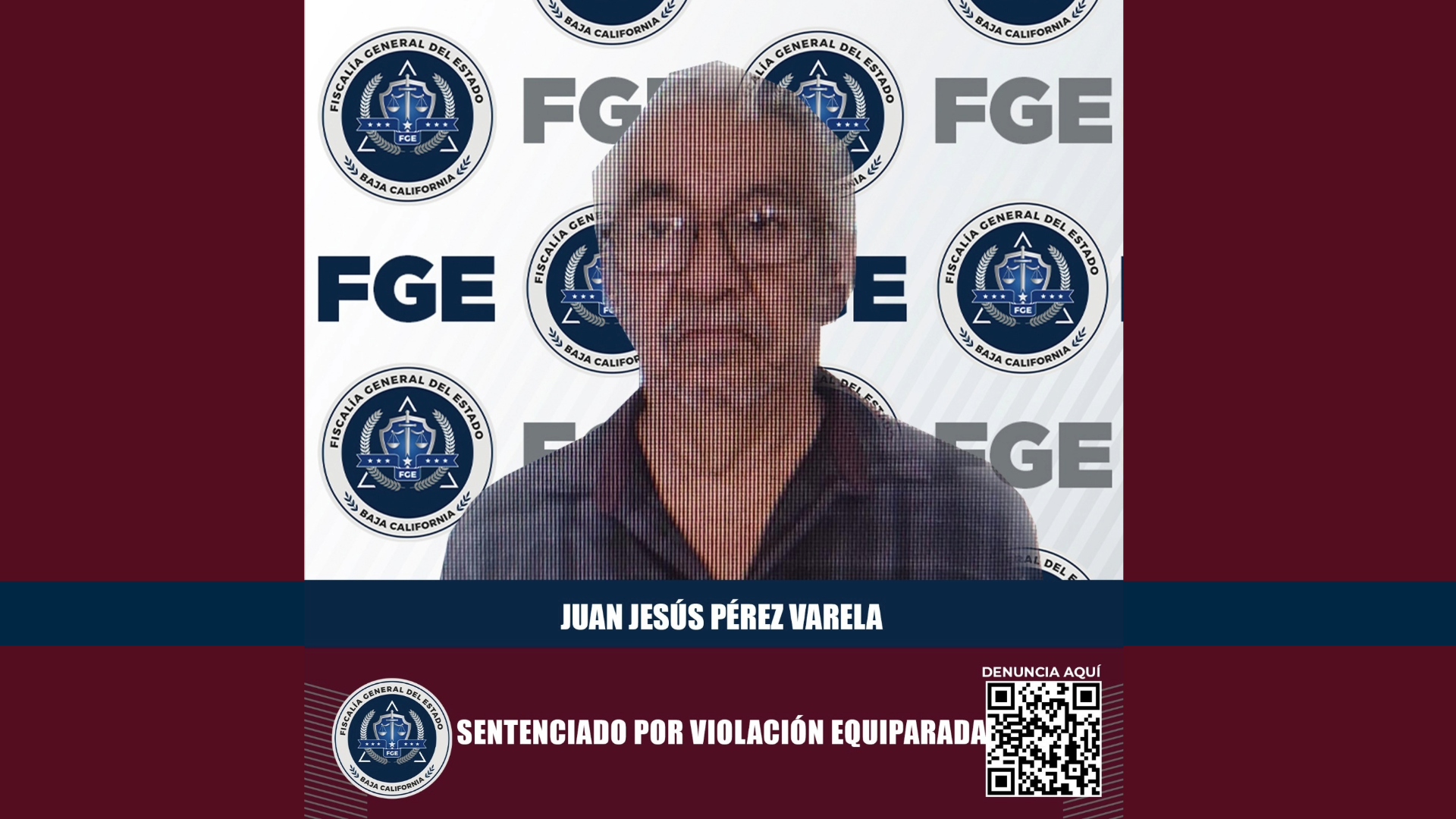Mexicali, Baja California.- La Fiscalía General del Estado (FGE), en el firme ejercicio de búsqueda de la justicia, para no dejar impunes actos de violencia en contra de las mujeres, niñas, niños y personas vulnerables, obtuvo una sentencia de 14 años y 8 meses de prisión para Juan Jesús Pérez Varela, penalmente responsable de los delitos de violación equipada y violación.