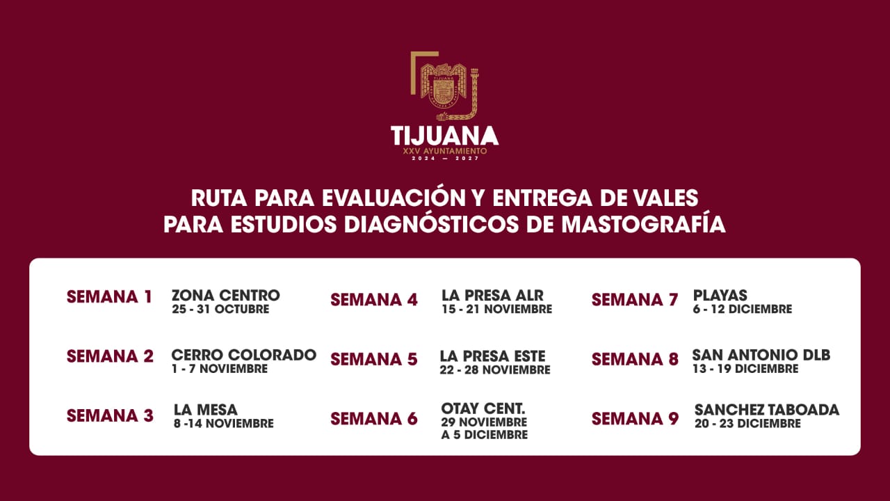 La ruta de la salud se realizará en Playas de Tijuana del 6 al 12 de diciembre; asimismo, en San Antonio de los Buenos la entrega de vales para estudios diagnósticos de mastografías será del 13 al 19 de diciembre; para concluir con este programa de atención, del 20 al 23 de diciembre la Dirección Municipal de Prevención, Control y Sanidad, otorgará este beneficio en la demarcación Sánchez Taboada.